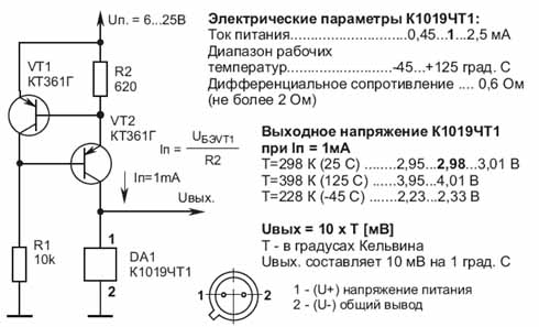 VT1, VT2, R1, R2 - вхідна схема термодатчика. Ця схема забезпечує на вході термодатчика постійний струм 1 мА.
