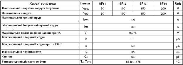 Далі необхідно вибрати діод. Діод повинен бути імпульсний, малопотужний, з величиною зворотнього струму менш одиниць мікроампер. За усіма параметрами нам підходить SF14. Ось так він виглядає