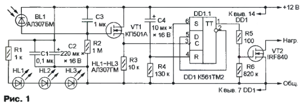 Когда уровень на прямом выходе триггера высокий, поступающее с него напряжение открывает полевой транзистор VT2, управляющий нагрузкой, включенной в цепь стока транзистора. Цепь С4R4 служит для установки триггера при включении питания в состояние с низким уровнем на прямом выходе. Это гарантирует, что после неожиданного перерыва в подаче питания транзистор VT2 будет закрыт, а нагрузка не включится "сама собой".