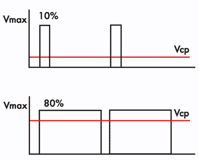 Широтно-импульсная модуляция, рассматриваемая в следующих примерах, используется в разных задачах - от формирования звукового сигнала и управления яркостью светодиодов до управления скоростью вращения электромотора. Все эти задачи основываются на базовом принципе ШИМ-сигнала - чем больше скважность импульсов, тем больше среднее значение напряжения (рисунок 3). Зависимость среднего напряжения от величины скважности является линейной: