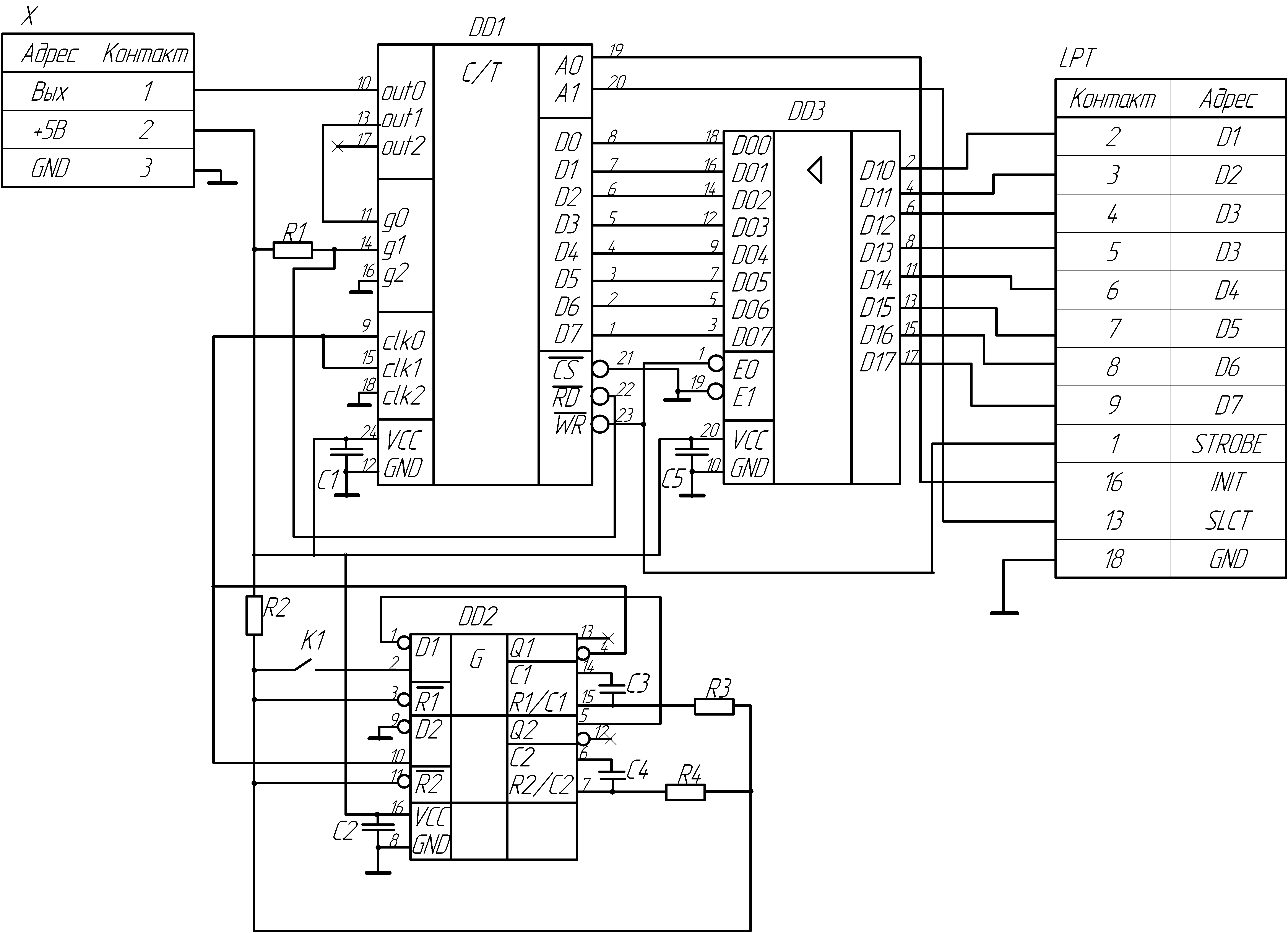 В нашем случае, так как предполагается чтения из порта, а только запись в порт, то регистр Status не используется. Регистр Data используется для передачи байта в программируемый таймер-счётчик, а биты 0,1 и 2 регистра Control для выставления строба записи и выбора режима записи в таймер-счётчик.