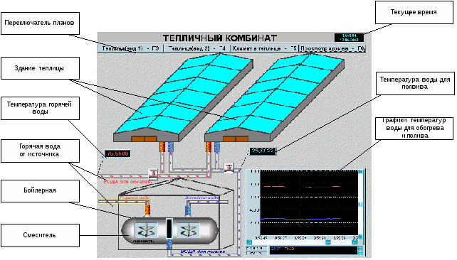 Регистрация и отображение значений контролируемых параметров (температура и влажность воздуха и почвы, положения регулирующих клапанов, форточек, освещенность и т.д.) в виде мнемосхем, на которых размещены: планы объектов, изображения приборов и установок, шкалы, положения регулирующих клапанов, движущиеся агрегаты и т. п.