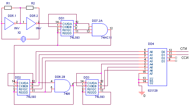 Формирование требуемой длительности и временного положения СГИ и ССИ осуществляется с помощью программируемого ПЗУ DD4.