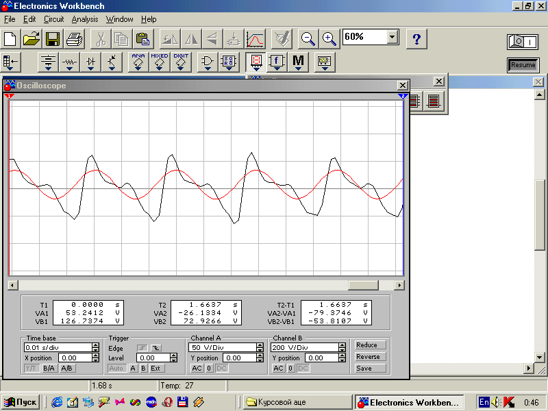Рисунок 3 – Осциллограммы выходного и входного сигнала(красным – входной сигнал, черным – выходной сигнал).