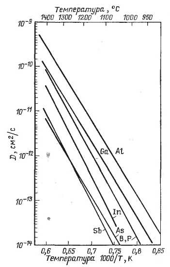 Рисунок 2.4 - Коэффициенты диффузии для часто встречающихся примесей в кремнии.