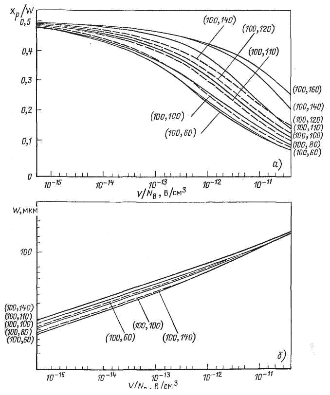 Рисунок 3.6 - Зависимости отношения ширины р-слоя объемного заряда к общей ширине области объемного заряда от общего напряжения, отнесенного к концентрации примеси в n-базе (а) и суммарной ширины области объемного заряда и емкости от V/N>B> (б). Кривые показаны для различной глубины хj гауссовско-го диффузионного перехода при 300 К для NB/N0 в промежутке от 3·108 до 3·104