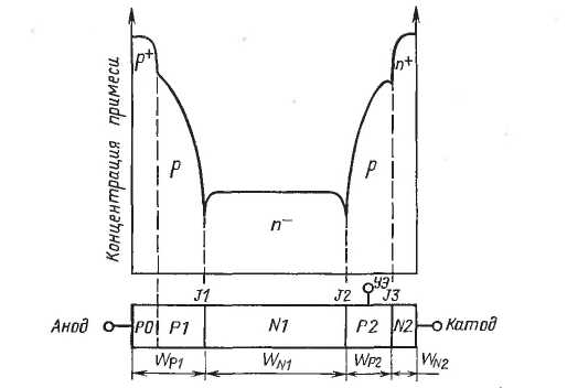 Для обеспечения высокого напряжения пробоя силовых тиристоров свыше 1000 В необходимо слои Р1 и Р2, которые формируют обратный и прямой блокирующие переходы J1 и J2 соответственно, создавать путем диффузии. Их ширина W>P1> = W>P2> +W>N2> изменяется в интервале от 30 до 140 мкм.