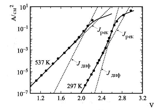 В 4H-SiC диодах при малых плотностях тока основную роль играют генерация и рекомбинация носителей в области пространственного заряда (ОПЗ) р-n-перехода и их диффузионный перенос через базу. В диодах практически отсутствуют "избыточные" токи, связанные с различного рода неоднородностями структуры и обусловленные, например, механизмами полевого и термополевого туннелирования. На рис. 2.1 в качестве примера показаны прямые вольтамперные характеристики (ВАХ) 6-кВ диода, измеренные при температурах 297 и 537 K в диапазоне плотностей прямого тока j>пр>= 10−7−1 А/см2. В указанном интервале плотностей тока ВАХ хорошо аппроксимируются суммой рекомбинационного (j>рек>) и диффузионного (j>диф>) токов с учетом омического падения напряжения на базе диода j>пр>r>б>, где r>б> - сопротивление базы):