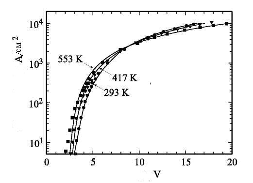ВАХ 6-кВ диода, измеренная при температуре 685 K. Как видно из этого рисунка, j>к> ∞ (V>бэ> + V)1/2 (V>бэ> — контактная разность потенциалов р—n-перехода). Таким образом, обратный ток обусловлен термической генерацией носителей в ОПЗ р—n-перехода.