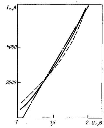 Рисунок 1.6 - Вольт-амперная характеристика тиристора типа Т173-1250 в открытом состоянии и ее линейная (–·–·–) и степенная (------) аппроксимации: U>т> = 0,119i0,32