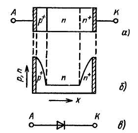 Обычно полупроводниковые диоды имеют несимметричные p-n переходы. Поэтому при полярности внешнего напряжения, при которой происходит понижение потенциального барьера в p-n переходе, то есть при прямом направлении для p-n перехода, количество носителей заряда, инжектированных из сильнолегированной в слаболегированной область, значительно больше, чем количество носителей, проходящих в противоположном направлении. Область полупроводникового диода, в которую происходит инжекция неосновных для этой области носителей заряда, называют базой диода. Следовательно, в диоде базовой областью является слаболегированная область [4].