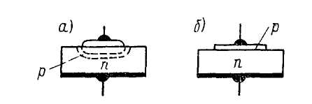 Рисунок 2.6. - Принцип устройства плоскостных кремниевых диодов, изготовленных сплавным (а) и диффузионным (б) методом