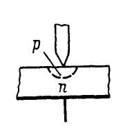 Принцип устройства точечного диода показан на рис. 1.2. Тонкая заостренная проволочка (игла) с нанесенной на нее примесью приваривается при помощи импульса тока к пластинке полупроводника с определенным типом электропроводности. При этом из иглы в основной полупроводник диффундируют примеси, которые создают область с другим типом электропроводности. Этот процесс называется формовкой диода. Таким образом, около иглы образуется миниатюрный n-р-переход полусферической формы. Следовательно, разница между точечными и плоскостными диодами заключается в площади n - перехода [6] .