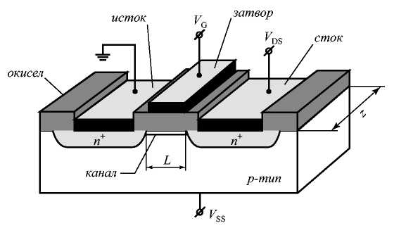 В области инверсии концентрация неосновных носителей заряда в инверсионном канале выше, чем концентрация основных носителей в объеме полупроводника. Напряжение на затворе V>G>, при котором происходит формирование инверсионного канала, называется пороговым напряжением и обозначается V>T>. Изменяя величину напряжения на затворе V>G> в области выше порогового напряжения, можно менять концентрацию свободных носителей в инверсионном канале и тем самым модулировать сопротивление канала R>i>. Источник напряжения в стоковой цепи V>DS> вызовет изменяющийся в соответствии с изменением сопротивления канала R>i> ток стока I>DS>, и тем самым будет реализован транзисторный эффект. Напомним, что транзисторный эффект заключается в изменении тока или напряжения во вторичной цепи, вызванном изменениями тока или напряжения в первичной цепи. Отметим, что ток в цепи «исток - канал - сток» I>DS> обусловлен только одним типом носителей, то есть действительно МДП-транзистор является униполярным прибором. Поскольку области истока и стока сильно легированы, то они не оказывают влияния на ток канала, а только обеспечивают контакт к области канала [8].