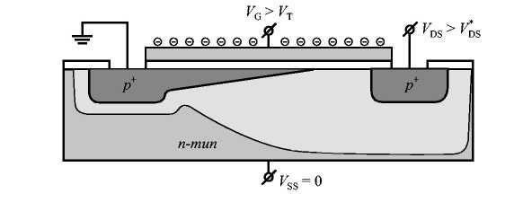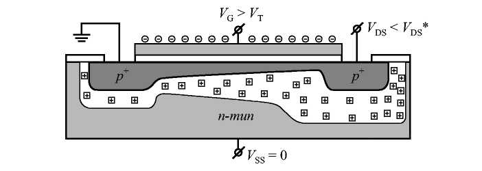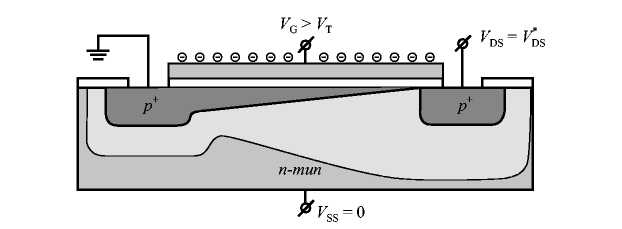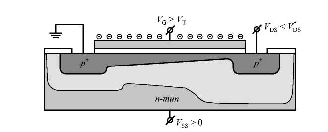 Напряжение, подаваемое на подложку V>SS>, управляет током в канале через изменение заряда в области обеднения Q>B>, или, что то же самое, через изменение порогового напряжения V>T>. Для эффективного увеличения ширины области обеднения, следовательно, заряда в области обеднения необходимо подавать обратное смещение на индуцированный электронно-дырочный переход «канал - подложка». Для n-канальных транзисторов это условие соответствует отрицательному знаку напряжения на подложке V>SS> < 0, а для p-канальных транзисторов - положительному знаку напряжения V>SS> > 0. На рис. 1.7 приведена схема p-канального МДП-транзистора в области плавного канала при наличии управляющего напряжения на подложке [5].
