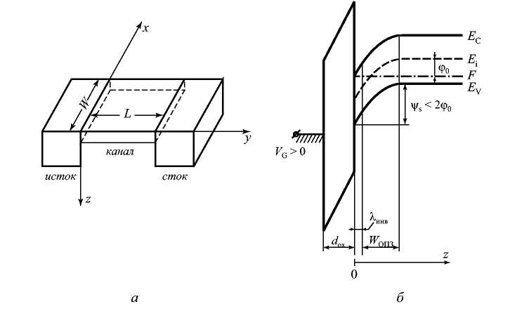 Рассмотрим полевой транзистор со структурой МДП, конфигурация и зонная диаграмма которого приведены на рис. 1.8. Координата z направлена вглубь полупроводника, y - вдоль по длине канала и х - по ширине канала.
