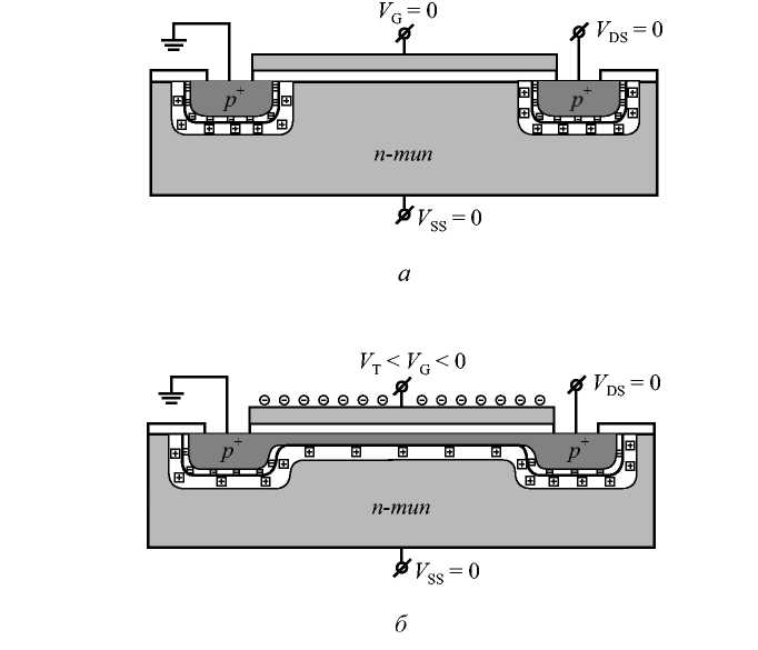 На рис. 1.5 показана схема МДП-транзистора с индуцированным p-каналом в равновесных условиях (V>DS> = 0) при нулевом напряжении на затворе и при напряжении на затворе выше порогового напряжения.