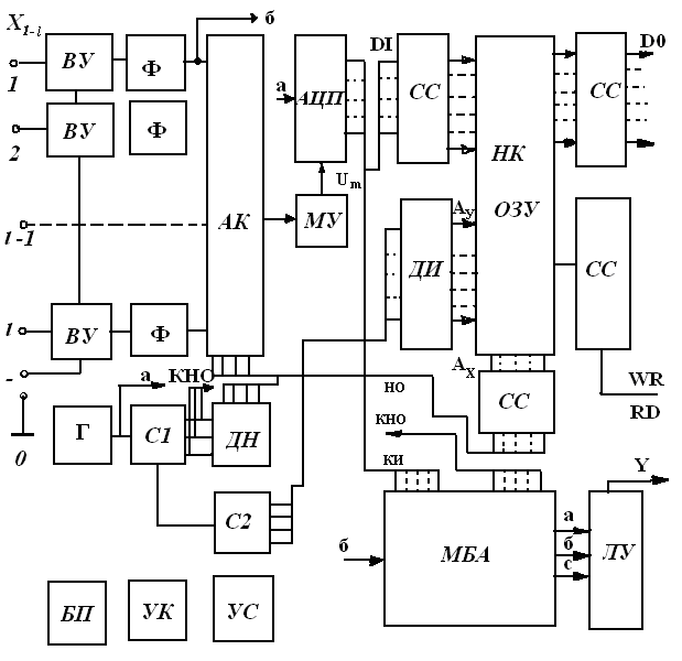 Положительные электроды отведений подключаются на l входов Х>1>>l>>,> сигналы которых усиливаются ВУ и через фильтр подаются на аналоговый коммутатор АК. В качестве фильтра нижних частот можно применять фильтр Баттерворта или другой тип такого звена. Коммутатор на АК подключает каждое из отведений с частотой f>k> = 100 Гц к АЦП, входные коды которого записываются в ОЗУ. Синхронное управление МЦК выполняется схемой синхронизации (СХС), состоящей из генератора Г задающей частоты f>зд>, счетчиков делителя С1, С2, дешифратора номеров ДН отведений и дешифратора ДН номеров временных интервалов ЭКГ. Если выбрать соотношение: