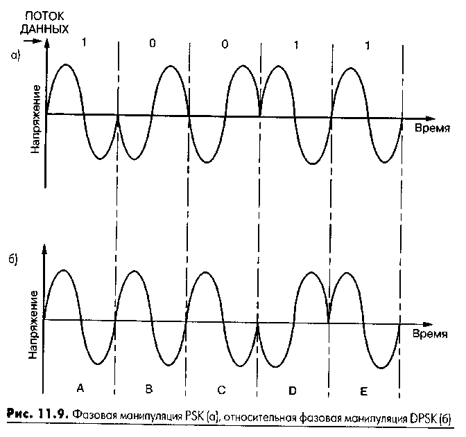 Цифровая модуляция, также называемая фазовой модуляцией, во многих отношениях очень похожа на ЧМ. Как и в случае с ЧМ, анализ спектра является достаточно сложным, а оба спектра оказались бы похожими. Наиболее подходящими методами цифровой модуляции для передачи сигналов цифрового ТВ через спутник связи являются BPSK (двоичная фазовая манипуляция), QPSK (квадратурная фазовая манипуляция), 8-PSK и, возможно, 16-QAM (квадратурная амплитудная модуляция). Из этих четырех методов наиболее часто используется QPSK. Он имеет преимущество, поскольку может работать при мощности транспондера, близкой к насыщению, то есть с эффективной отдачей энергии. В табл. 5. 2 приведены теоретические значения E>b>/N>0>, требуемые для достижения величины ВЕR, равной 10 - 10, без кодирования канала связи для различных методов модуляции. Метод 64-QAM часто выбирается для системы кабельного распределения каналов, потому что он обладает высокой эффективностью использования полосы пропускания при постоянно доступной ширине полосы пропускания 6-8 МГц.