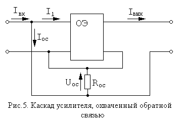 Ток в цепи обратной связи прямопропорционален падению напряжения на резисторе R>ос>, которое равно падению напряжения на параллельно включенных сопротивлении ОС и входном сопротивлении каскада: