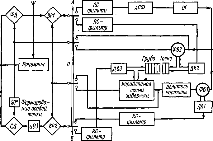 Фазовая автоподстройка опорного генератора сигналами ведущей станции производится следующим образом. Поиск передней части поверхностного сигнала предполагается уже выполненным. Поэтому в схеме должна осуществляться соответствующая коммутация переключателя П в такт приема сигналов береговых станций, а опорные кратковременные стробы временного различителя ВР1 на выходе ФД должны выделять лишь ту часть напряжения рассогласования, которая соответствует передней части поверхностных радиоимпульсов. Отстробированные напряжения передаются на блок фазовой автоподстройки АПФ опорного генератора. В результате фаза >0> опорного генератора изменяется до тех пор, пока не будет отличаться точно на 90° от фазы ВЧ заполнения радиоимпульса и постоянное напряжение на выходе ФД, обусловливаемое поверхностным радиоимпульсом, не станет равным нулю. Таким образом, фаза » колебания на выходе опорного генератора будет хранить память о фазе ВЧ заполнения, поскольку >0> = >А> + 90°. Фаза опорного напряжения СД при этом будет точно совпадать с фазой ВЧ заполнения поверхностного радиоимпульса ведущей станции.