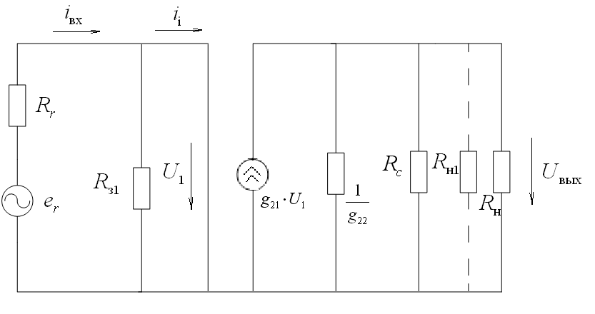 Схема замещения усилительного каскада показана на рисунке 6. В целях упрощения в схеме отсутствует проводимость g>11> и источник g>12>U>2> ввиду их незначительной величины. Сопротивления резисторов R>з1> и R>и1> определяется из соотношений:
