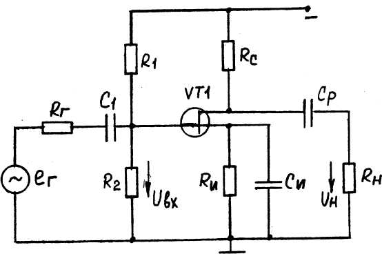 Схема усилительного каскада на полевом транзисторе с управляющими p-n-переходом и каналом р-типа показана на рисунке 5. Транзистор включён по схеме с общим истоком.