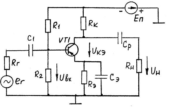 Упрощенная схема каскада, выполненного на биполярном транзисторе типа р-n-р, включенного по схеме ОЭ, приведена на рисунке 1. На схеме обозначены: R>1>, R>2> - резисторы входного делителя, обеспечивающего нужное смещение на базе транзистора, R>к>, R>э> - соответственно коллекторный и эмиттерный ограничивающие резисторы, R>н> - сопротивление нагрузки. В простейшем случае резисторы R>2> и R>э> могут отсутствовать (R>2>= ∞, R>э>=0), R>г> - внутреннее сопротивление источника сигнала (генератора). С>вх>, С>р> - разделительные конденсаторы. Резистор R>э> и конденсатор С>э> образуют цепь отрицательной обратной связи по току эмиттера. Полагаем, что на вход (на базу транзистора) относительно общей точки подаётся синусоидальный входной сигнал с такой амплитудой, чтобы каскад работал в квазилинейном режиме и на нагрузке выделялся усиленный синусоидальный сигнал. Это обеспечивается соответствующим выбором положения рабочей точки на характеристиках транзистора.