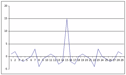 Нашу М-последовательность мы либо инвертируем (умножаем на «-1» нашу комбинацию), либо оставляем такой, какая есть. Затем складываем столбцы. Нули заменяются на «-1», а единицы – на «+1». Разность между «+1» и «-1» является результатом, который записывается после черты. По этим результатом строим функцию корреляции.
