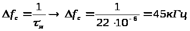 Спектральная плотность мощности такой последовательности иммет вид функции (sin2x)/x2, максимум которой находится на несущей частоте, а ширина главного лепестка по первым нулям спектральной плотности равна ∆f>0 >= 2/τ>и>. На практике и в литературе обычно ширина спектра определяется полосой частот, в которой сосредоточенно (80-90)% энергии (мощности) сигнала. По этому критерию для радиоимпульса прямоугольной формы обычно принимается: