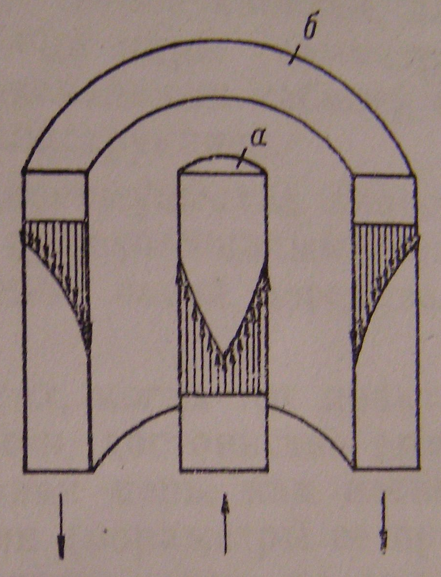 Поле Нб>φ> проводника б изображено в соответствии с законами электродинамики, согласно которым внутри полого цилиндра магнитное поле отсутствует, а вне его выражается таким же уравнением, как и для сплошного проводника: