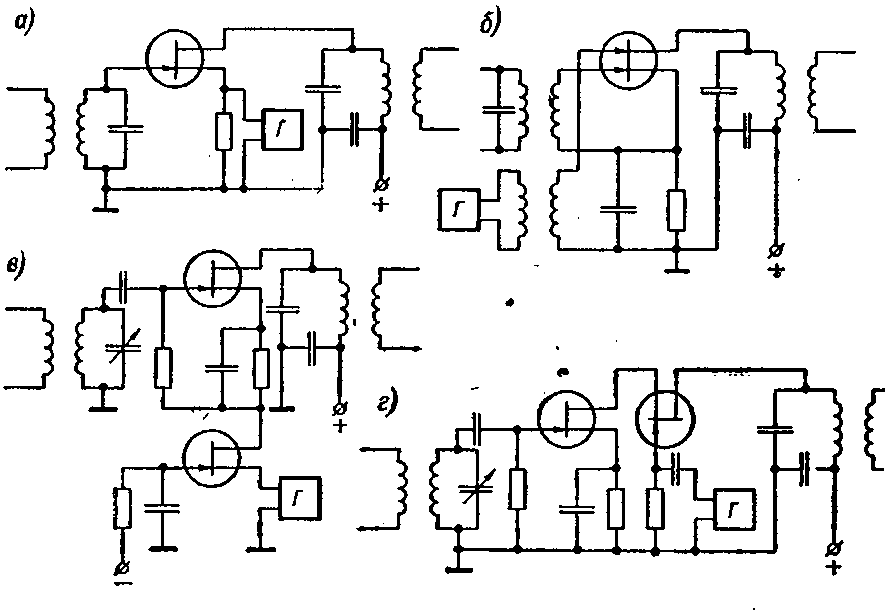 На рисунке 3, а показана схема преобразователя со смесителем на полевом МОП-транзисторе. Напряжение гетеродина подается в цепь истока транзисторного смесителя. Другая схема (рисунок 3, б) с двухзатворным смесителем. Здесь напряжение гетеродина и сигнала подаются на разные затворы. Этим достигается хорошая развязка контуров гетеродина и сигнала, а также требуется меньшая амплитуда гетеродина, чем в схеме с обычным МОП-транзистором. Еще большое ослабление связи между упомянутыми контурами обеспечивают схемы рисунок 3, в и г. Как видно из приведенных схем, полевые транзисторы соединены в них последовательно. Изменение крутизны по напряжению на затворе входного транзистора получается за счет изменения проводимости цепи сток—исток дополнительного транзистора при подаче на него напряжения гетеродина.