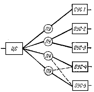 Передавать вещательные сигналы на удаленные от центральной станции ОУС трудно: затухание длинных СЛ превышает норму, а получить необходимое количества прямых СЛ не всегда возможно. В этих случаях предполагается применять промежуточные усилители ПУ (рис.2), устанавливаемые в районных АТС. С их помощью можно осуществить дополнительное усиление сигнала, например, в СЛ, идущей к ОУС-1, разветвлять каналы подачи программ, например к ОУС-2 И ОУС-3, и тем самым экономить некоторое количество СЛ, а также дополнительно резервировать отдельные участки каналов подачи программ, например СЛ к ОУС-4 и ОУС-5.