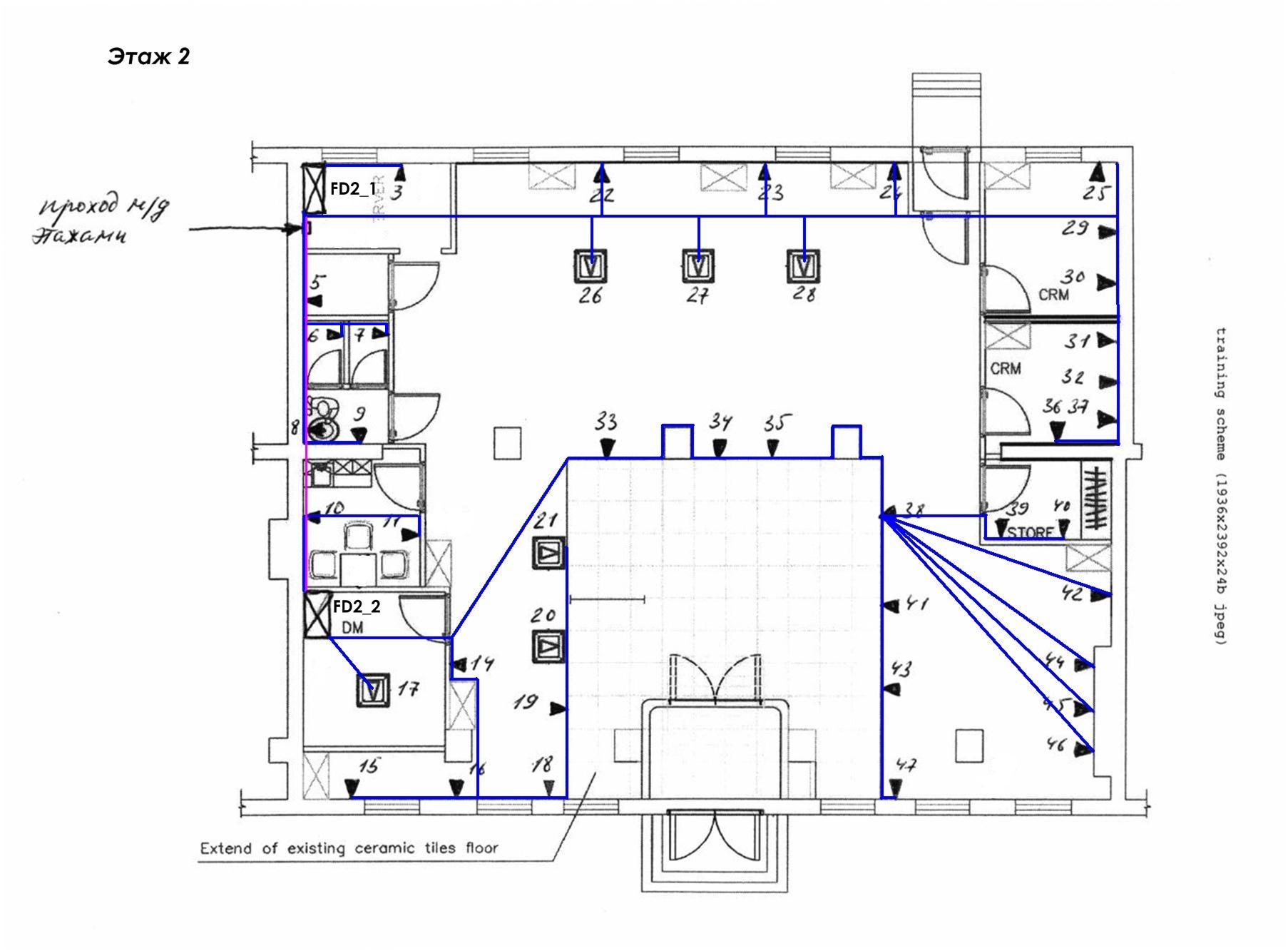 Проложить кабель по этажу так, чтобы до самого удалённого РМ было меньше 90 м по стандарту ISO 11801, с использованием 1-ого FD не удается, поэтому я принимаю решение использовать 2-й FD на каждом этаже.