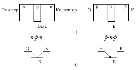 Биполярным транзистором называется электронный прибор с двумя взаимодействующими p-n -переходами и тремя или более выводами. P-n-переходы образуются тремя близко расположенными областями с чередующимися типами электропроводности: p-n-p или n-p-n . Такие транзисторы называют биполярными, так как их работа основана на использовании в качестве носителей заряда как электронов, так и дырок. Примерный вид структуры и обозначения на схемах биполярных транзисторов представлены на рис.3.1,а. Жирной чертой показаны невыпрямляющие контакты выводов; на рис.3.1,б даны обозначения n-p-n транзистора и p-n-p транзистора.