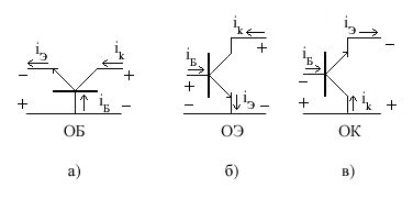 Возможны три схемы включения (по числу выводов) биполярного транзистора: с общей базой (ОБ), общим эмиттером (ОЭ) и общим коллектором (ОК). На рис.3.4. представлены эти схемы включения транзистора вместе с полярностью источников питания, причем указанная полярность обеспечивает активный режим. Напряжения обычно отсчитываются относительно общего вывода транзистора.