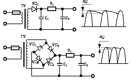 Рис.2. Принципиальные схемы однополупериодного и двухполупериодного выпрямителей