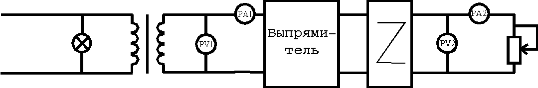 PV1 и PV2 – приборы, с помощью которых определяют потребляемую мощность. Выпрямленное напряжение определяют по показаниям вольтметра PV2.