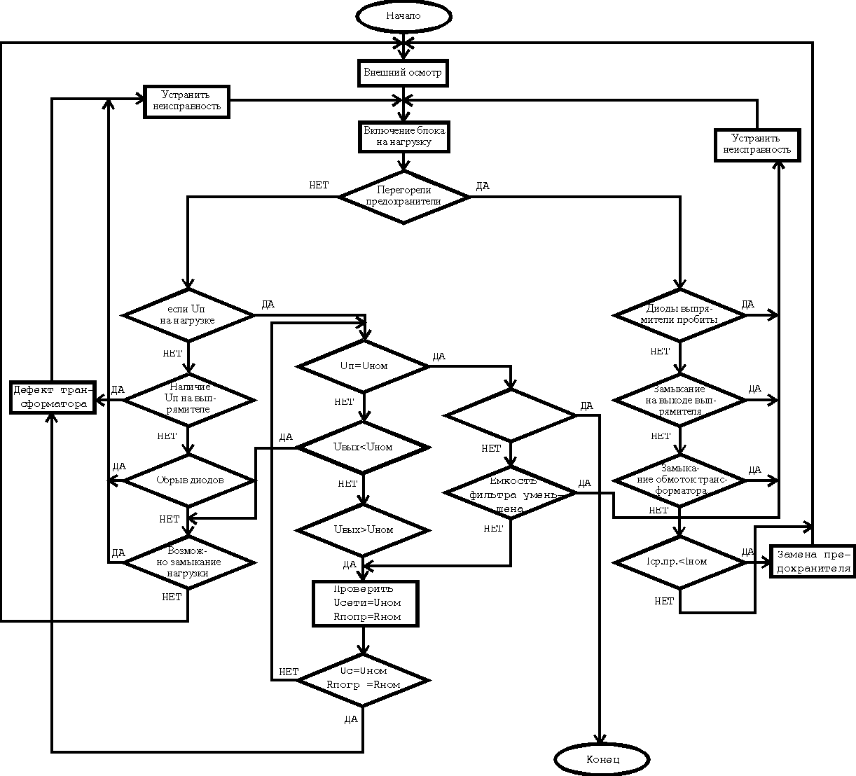 Из рисунка видно, что даже для простой схемы алгоритм поиска неисправностей достаточно сложен, а если добавить еще и фильтр, то алгоритм значительно усложнится. После исправления неисправностей (обрыв, замыкание) производят исследование характеристик НИП, если параметры не в норме.