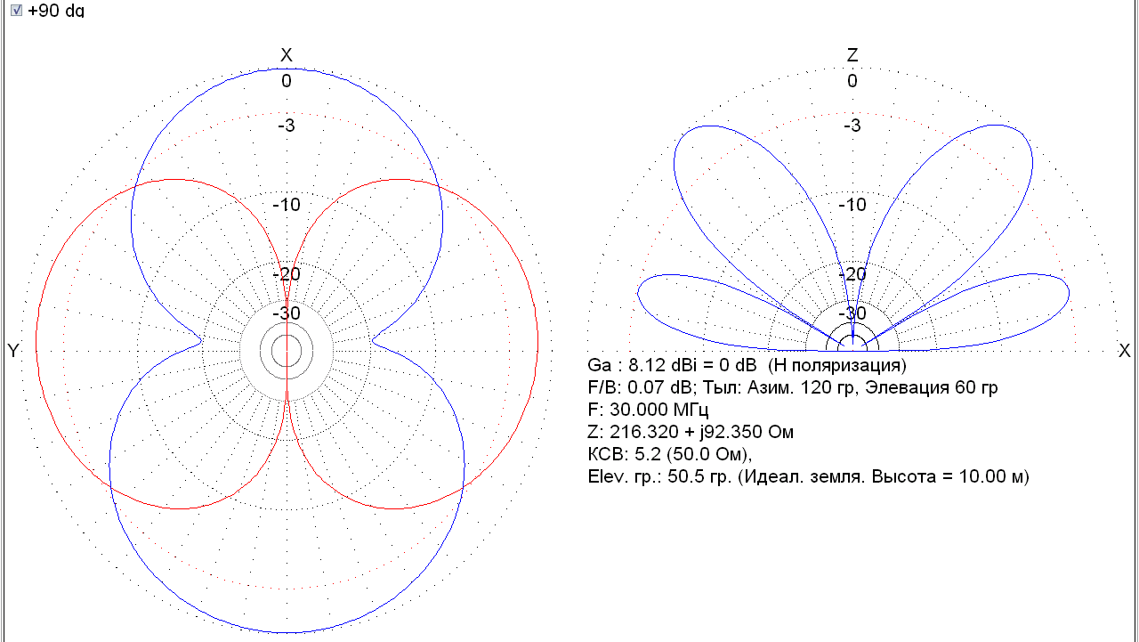 При використанні антени на висоті 10 метрів від ідеальної землі її ДС і параметри змінюються. Щодо ДС, то з’являються вже 4 пелюстки. Це характеризує кращі направлені властивості антени, тобто більшу її спрямованість.