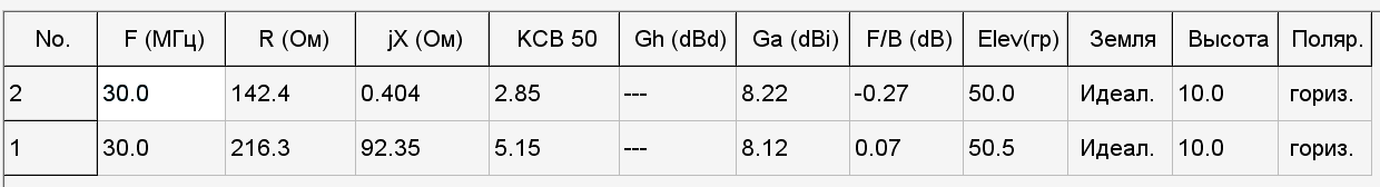 Оптимізація проводилася для антени, що розташована на відстані 10 м від ідеальної землі. Оптимізація проводилася за коефіцієнтом підсилення і коефіцієнтом стоячої хвилі (G>a> вибирався максимальним, КСХ – мінімальним).