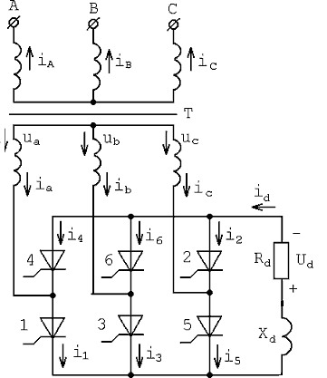 Нумерація вентилів у даній схемі відповідає порядку їхнього вступу в роботу за умови дотримання фазировки трансформатора (рис.1.1.).