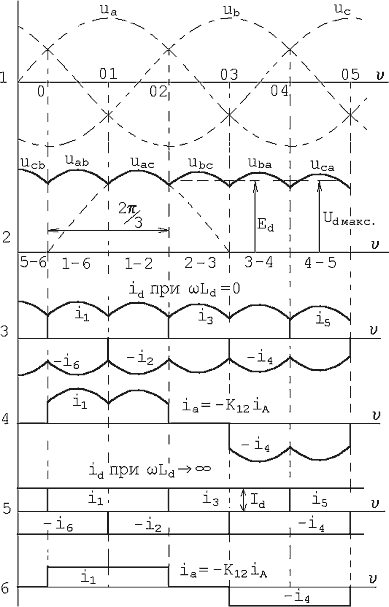 У проміжку ( 0-01) найбільше позитивне значення має напруга u>a> , подаване до анода вентиля 1, а найбільше негативне значення – напруга u>b>, що підводиться до катода вентиля 6. Отже, у цьому проміжку одночасно включені вентилі 1 і 6. Через вентиль 1 позитивна напруга u>a> підводить до нижнього затискача, а через вентиль 6 негативна напруга u>b> підводить до верхнього затискача опору R>d>. Тому випрямлене напруга u>d >= u>a>- u>b>