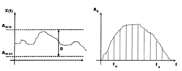 A>m>in – мінімальне значення сигналу в абсолютних одиницях (В, А, Гц); та смугою частот в спектрі сигналу x(t) від f>H>, до f>B> в герцах (кГц, мГц).