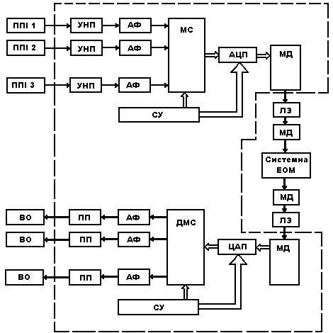 ППІ 1–3 – первинні перетворювачі інформації; УНП – узгоджувально-нормувальні пристрої; АФ – аналогові фільтри; МС – мультиплексор; АЦП – аналого-цифровий перетворювач; МД – апаратура передачі (приймання) даних (модем); ЛЗ – лінія зв'язку; ЦАП – цифро-аналоговий перетворювач; ДМС – демультиплексор сигналів; ПП – підсилювач потужності; ВО – виконавчий орган.