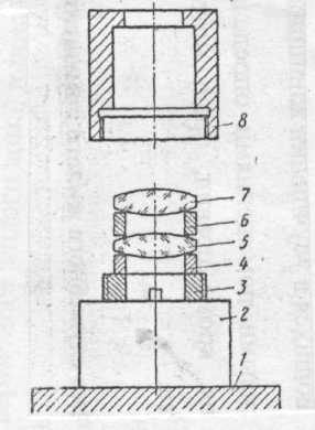 При сборке склеенных линз (линзы 1 и 2, см. рис. 6) растачивают оправу под линзу по диаметру флинтовой линзы с возможно меньшим зазором. Расточку ведут на глубину, обеспечивающую получение необходимого воздушного зазора менаду линзами.