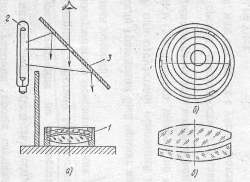 На рис. 5, б показана подобная картина. Как видно из рисунка, центр колец смещен от перекрестия в сторону более толстой прокладки. Ее необходимо переклеить (велик слой клея) или подшабрить. У объектива, воздушный промежуток которого не имеет клиновидности, кольца располагаются концентрично относительно изображения перекрестия экрана.