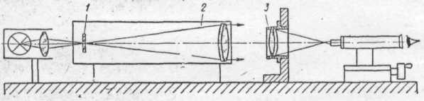 Качество объектива телескопической системы определяется пределом разрешения и качеством изображения точечного источника света. Пределом разрешения объектива называют наименьшее угловое расстояние между точками или линиями, которые объектив воспроизводит раздельно. Объективы телескопических систем имеют малое угловое поле зрения, поэтому качество изображения таких приборов контролируют в центре поля объектива. Короткофокусные объективы проверяют на оптической скамье, схема которой приведена на рис. 8. Контролируемый объектив 3 устанавливают в держатель, опорная плоскость которого перпендикулярна оси коллиматора 2, а посадочный диаметр соосен с оптической осью коллиматора. Диаметр линз коллиматорного объектива не должен быть меньше диаметра зрачка входа проверяемого объектива, а фокусное расстояние коллиматора в 2—3 раза должно превышать фокусное расстояние испытуемого объектива.