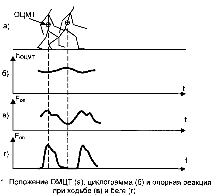 При рассмотрении циклограммы видим, что снижение ОЦМТ совпадает со второй половиной опорного времени, т.е. когда опорная нога находится сзади от ОЦМТ. В этом положении нарушено равновесие, и тело начинает падать вперед. Тем временем другая нога выносится вперед и в некоторый момент создает новую опору. Теперь, за счет своей кинетической энергии, ОЦМТ поднимается вверх. И так процесс повторяется снова.