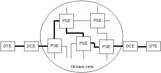 DTE получают доступ к сетевым ресурсам через PSE. PSE и структура их связей образуют "облако" (топологию) сети, они выполняют процедуры создания виртуальных каналов, передают пакеты по действующим виртуальным каналам. Виртуальные каналы в X.25 называют логическими каналами. Каждый физический канал в PSE поддерживает несколько логических каналов, каждый PSE в любом из своих портов поддерживает множество логических каналов.